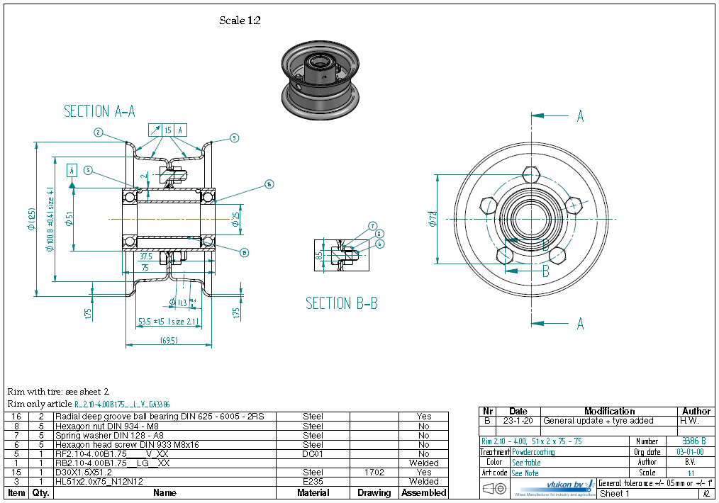1.75 mm thick two piece divided rim | diameter: 4 inch | width: 2.10 inch | bearing in hub: 6005-2RS