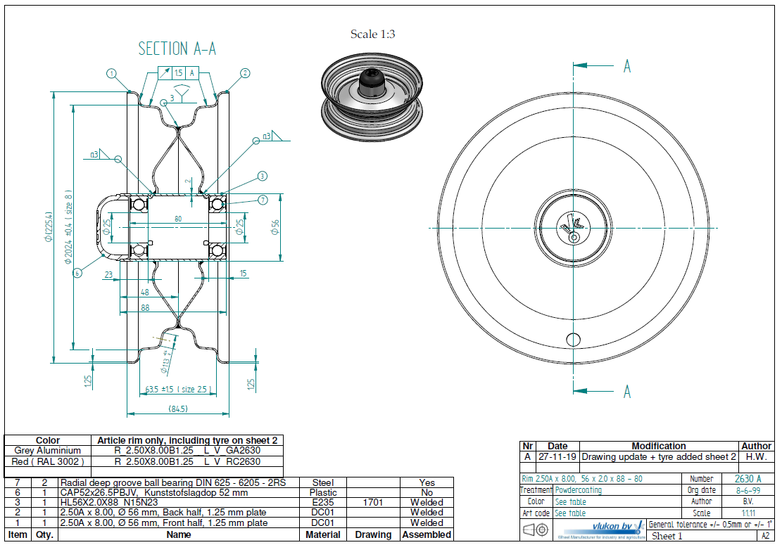 1.25 mm thick one piece welded RIM, diameter: 8 inch, width: 2.50 inch, bearing in hub: 6205-2RS