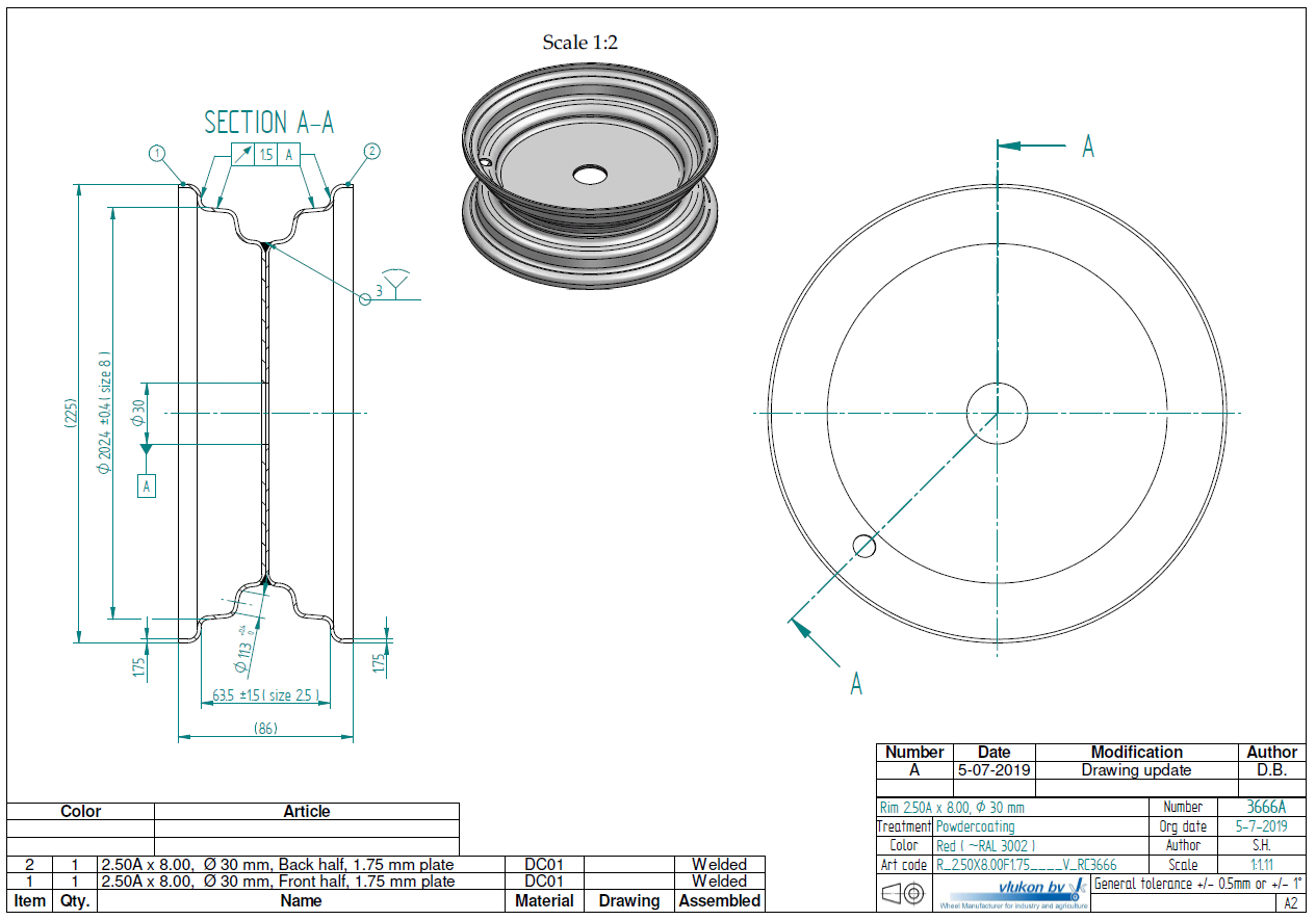 1.75 mm thick one piece welded RIM, diameter: 8 inch, width: 2.50 inch,