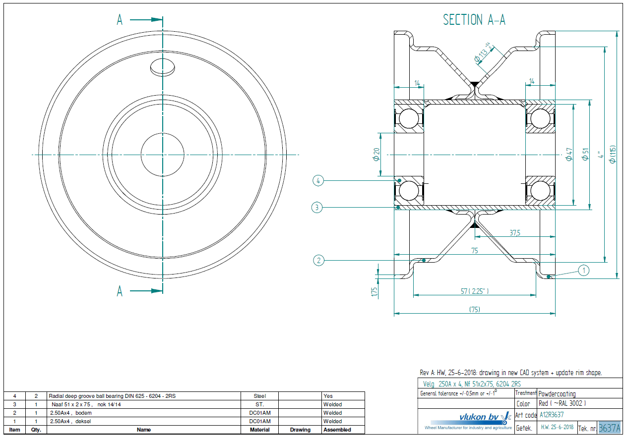 1.75 mm thick one piece welded RIM, diameter: 4 inch, width: 2.50 inch, bearing in hub: 6204-2RS