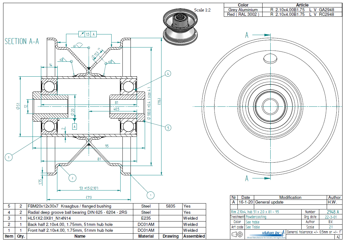 1.75 mm thick one piece welded RIM, diameter: 4 inch, width: 2.50 inch, bearing in hub: 6204-2RS-C3