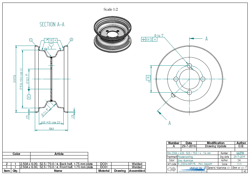 1.75 mm thick one piece welded RIM, diameter: 6 inch, width: 2.50 inch, pcd: 70mm & center bore: 52,5mm l 4 bolt holes