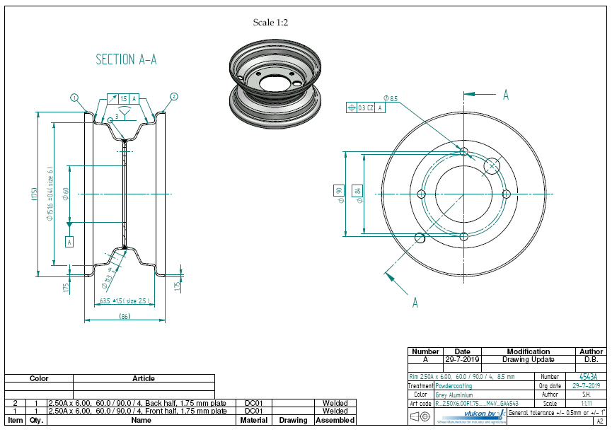 1.75 mm thick one piece welded RIM, diameter: 6 inch, width: 2.50 inch, pcd: 90mm & center bore: 60mm l 4 bolt holes