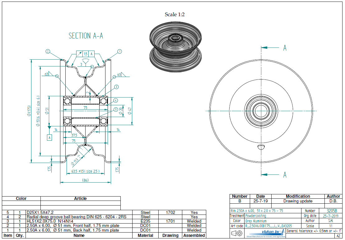 1.75 mm thick one piece welded RIM, diameter: 6 inch, width: 2.50 inch, bearing in hub: 6204-2RS