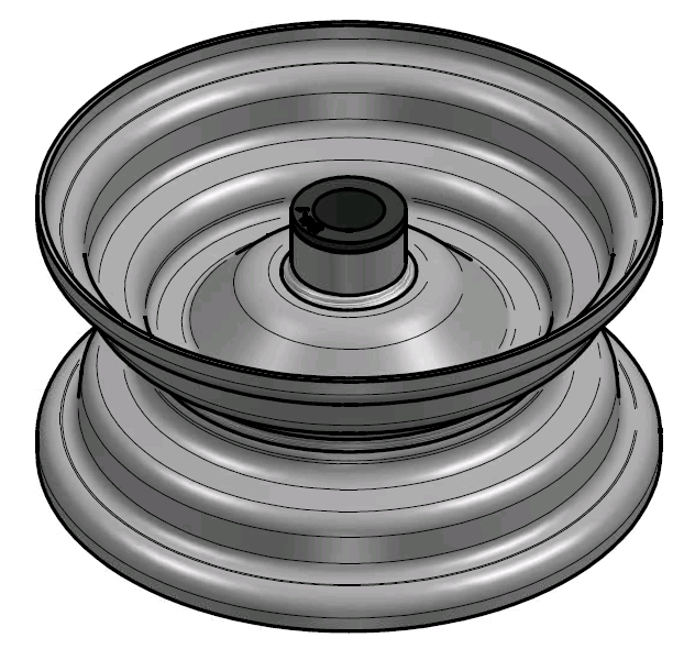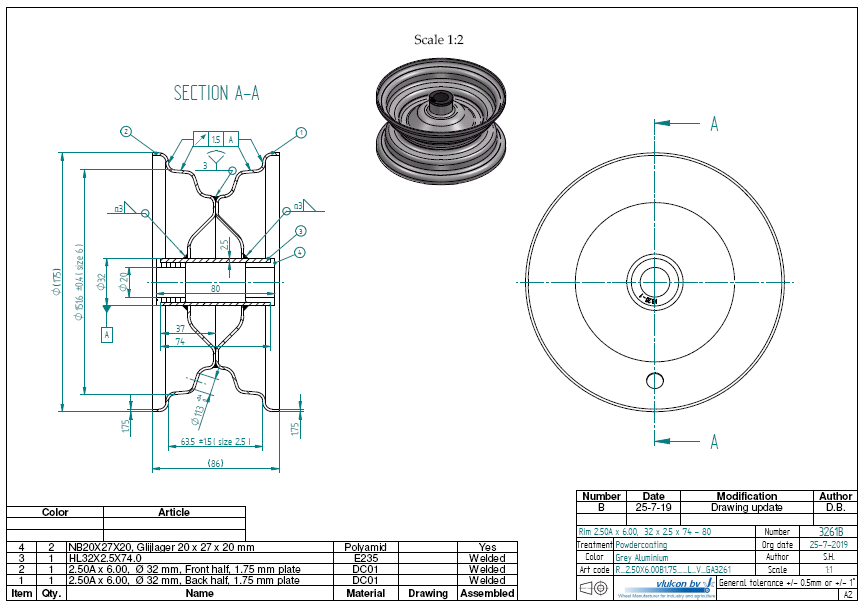 1.75 mm thick one piece welded RIM, diameter: 6 inch, width: 2.50 inch, bearing in hub: Plain bearing 20 mm with flange thickness 3 mm