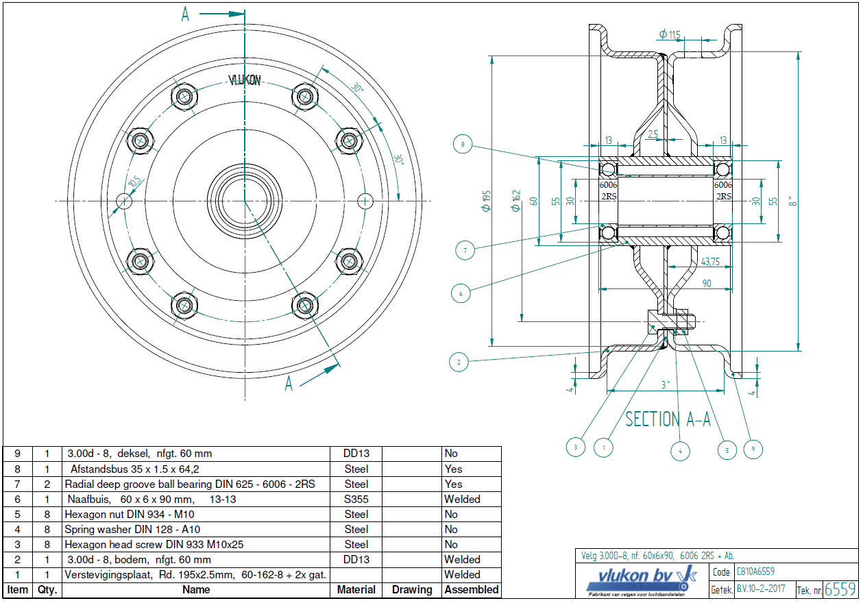 4.00 mm thick two piece divided rim | diameter: 8 inch | width: 3.00 inch | bearing in hub: 6006-2RS