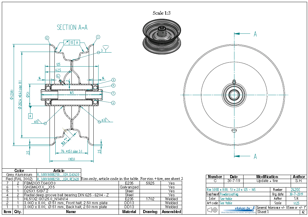 2.50 mm thick one piece welded RIM, diameter: 8 inch, width: 3.00 inch, bearing in hub: 6204-Z-C3
