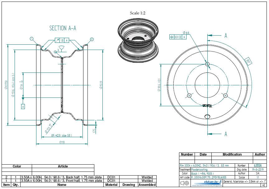 Rim size 3.50AX6H2 | 1.75 mm thick one piece welded RIM, diameter: 6 inch, width: 3.50 inc...