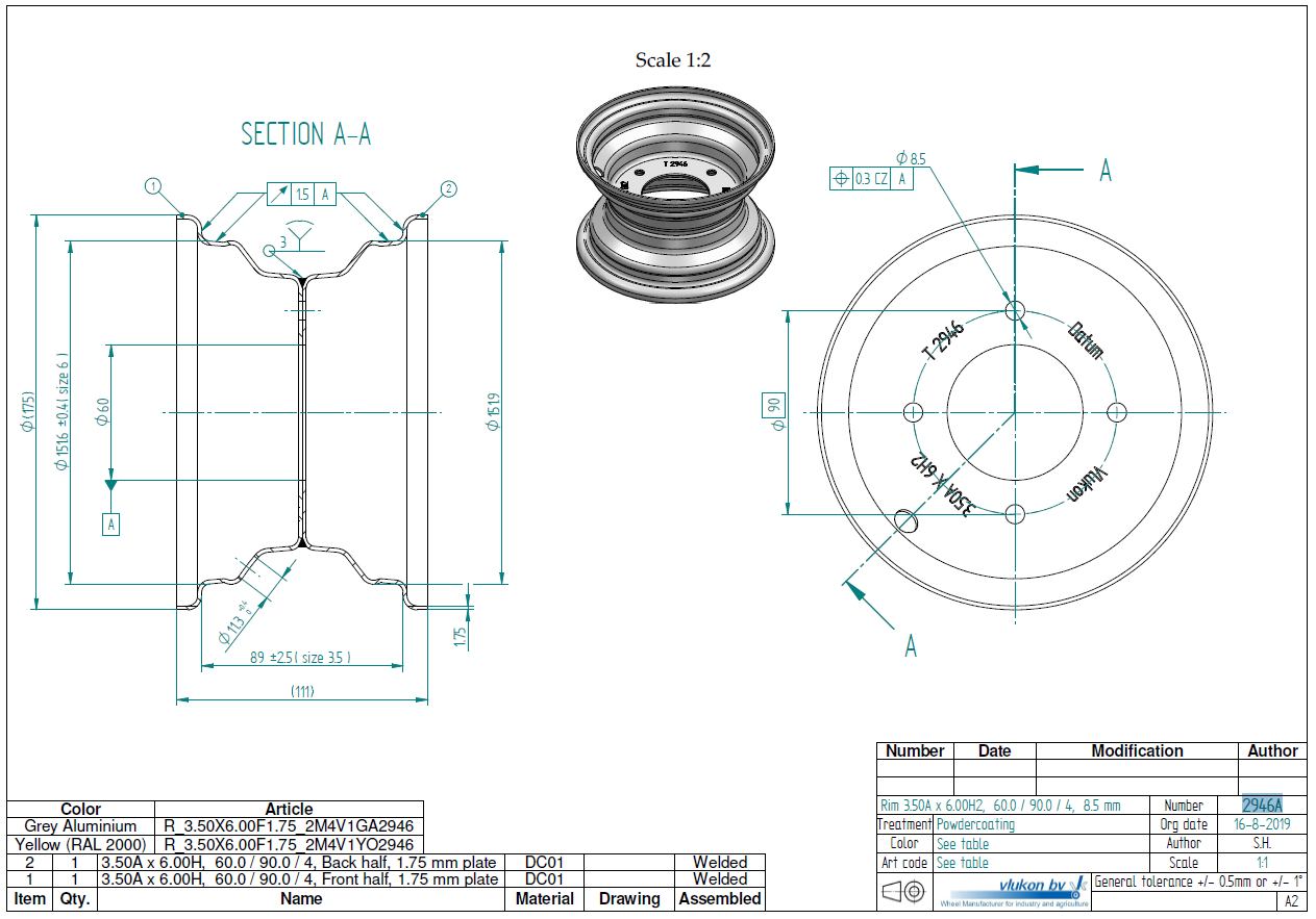 Rim size 3.50AX6H2 | 1.75 mm thick one piece welded RIM, diameter: 6 inch, width: 3.50 inc...
