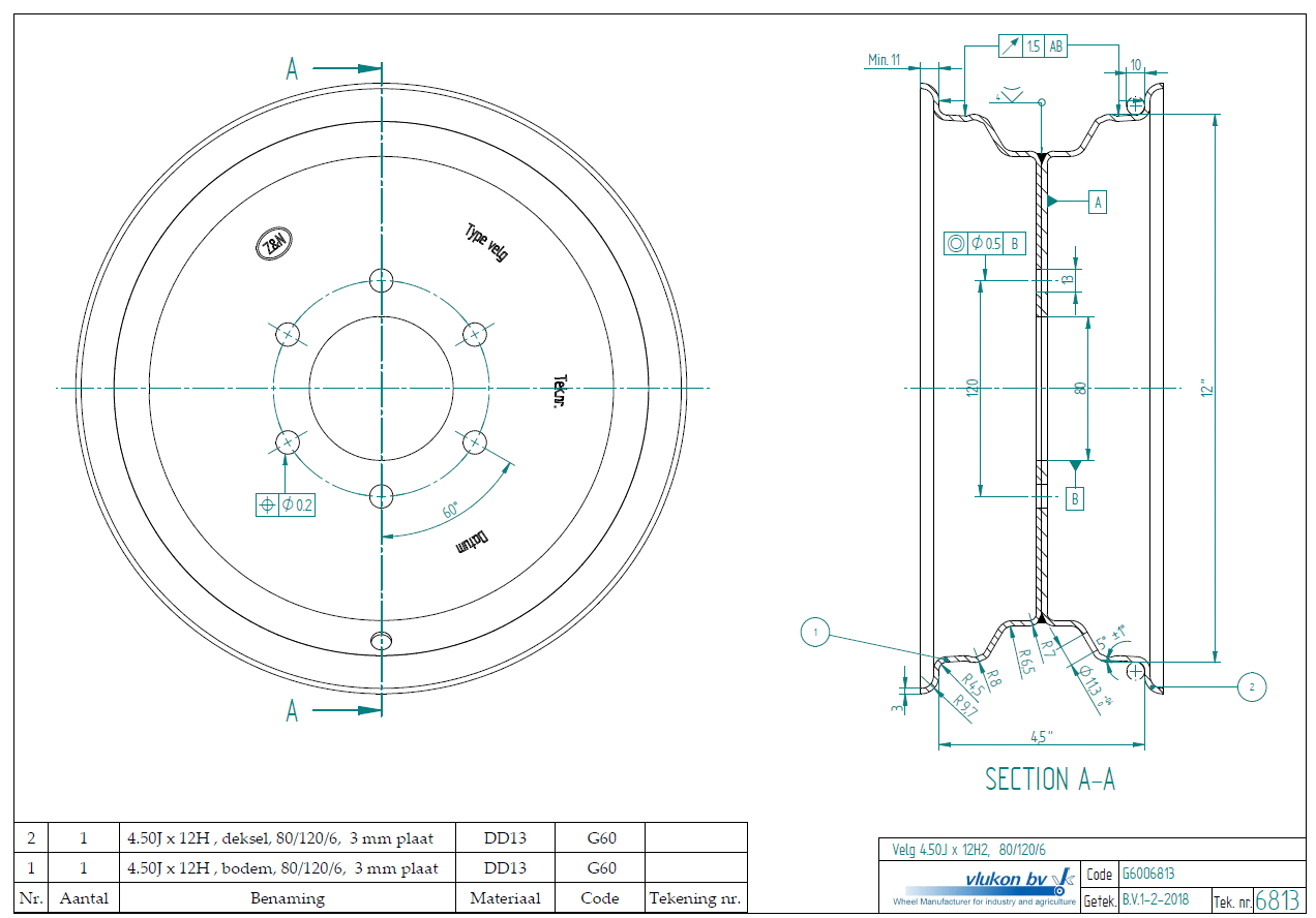 Wheel rim 4.50JX12 H2 for material handling, industrial high load trailers