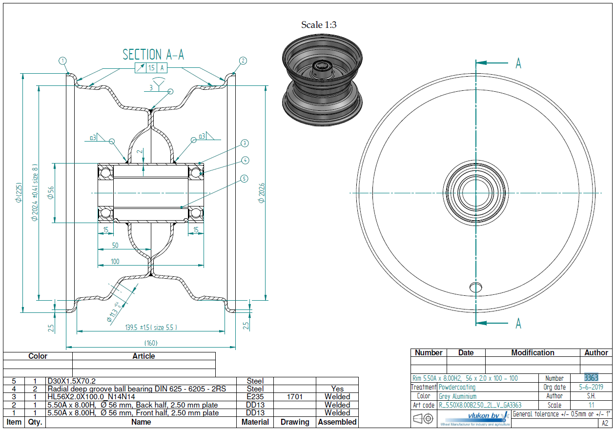 2.50 mm thick one piece welded RIM, diameter: 8 inch, width: 5.50 inch, bearing in hub: 6205-2RS
