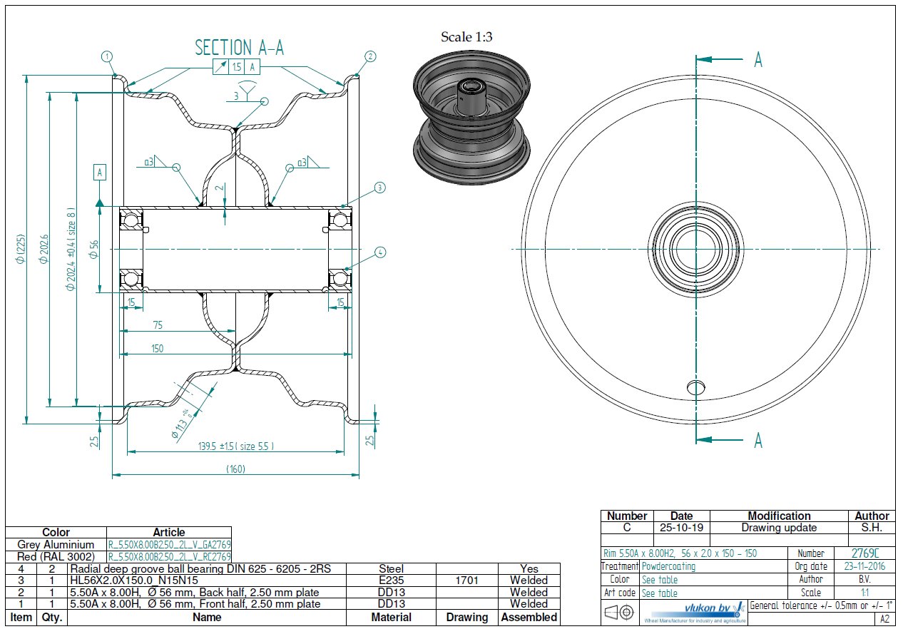 2.50 mm thick one piece welded RIM, diameter: 8 inch, width: 5.50 inch, bearing in hub: 6205-2RS