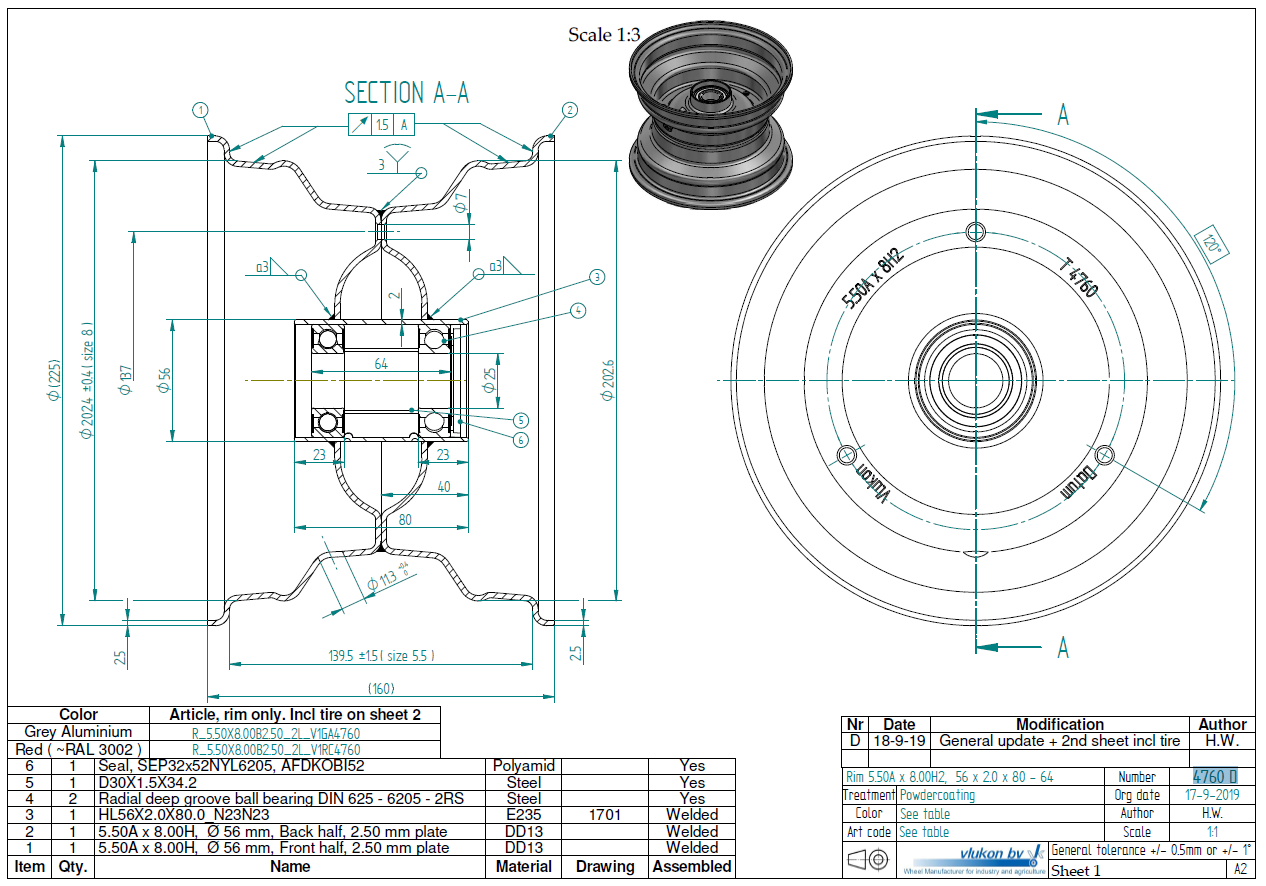 2.50 mm thick one piece welded RIM, diameter: 8 inch, width: 5.50 inch, bearing in hub: 6205-2RS