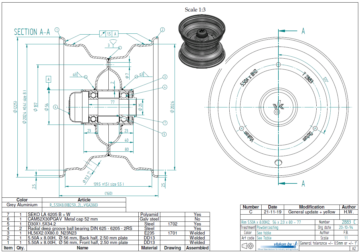 2.50 mm thick one piece welded RIM, diameter: 8 inch, width: 5.50 inch, bearing in hub: 6205-2RS