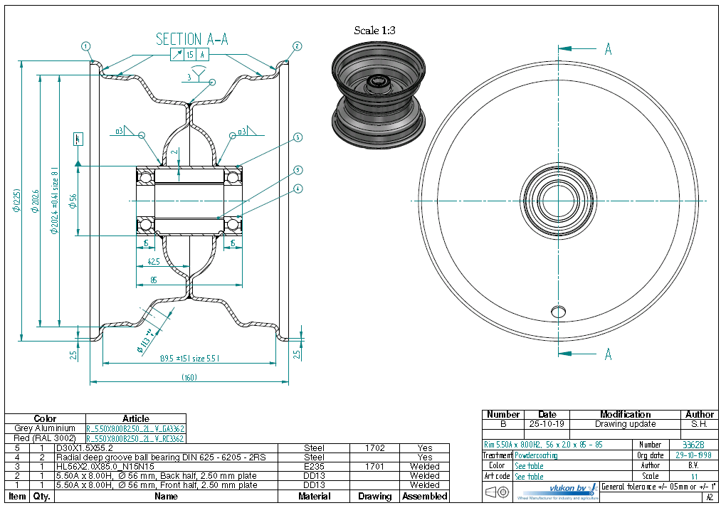 2.50 mm thick one piece welded RIM, diameter: 8 inch, width: 5.50 inch, bearing in hub: 6205-2RS