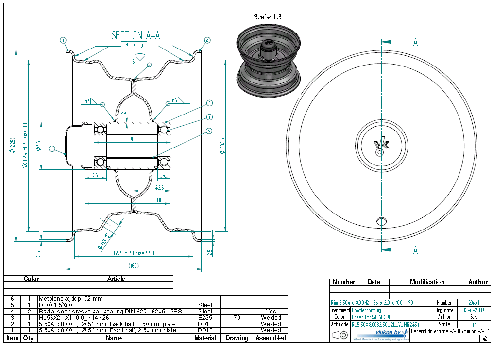2.50 mm thick one piece welded RIM, diameter: 8 inch, width: 5.50 inch, bearing in hub: 6205-RS