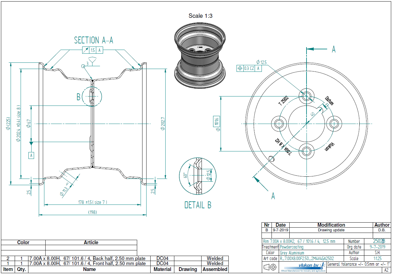 Rim size 7.00AX8H2 | 2.50 mm thick one piece welded RIM, diameter: 8 inch, width: 7.00 inc...