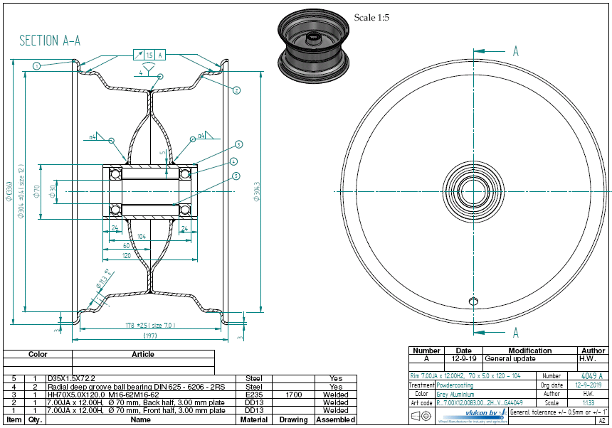 3.00 mm thick one piece welded RIM, diameter: 12 inch, width: 7.00 inch, bearing in hub: 6206-2RS