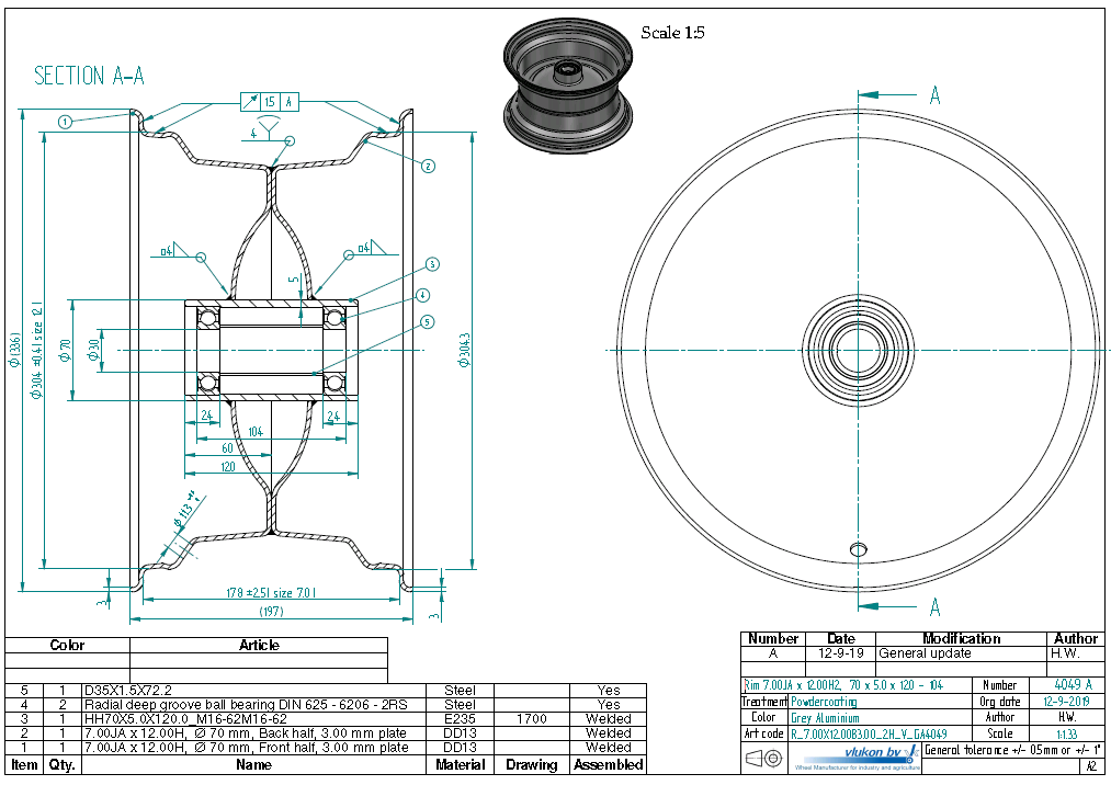 3.00 mm thick one piece welded RIM, diameter: 12 inch, width: 7.00 inch, bearing in hub: 6206-2RS